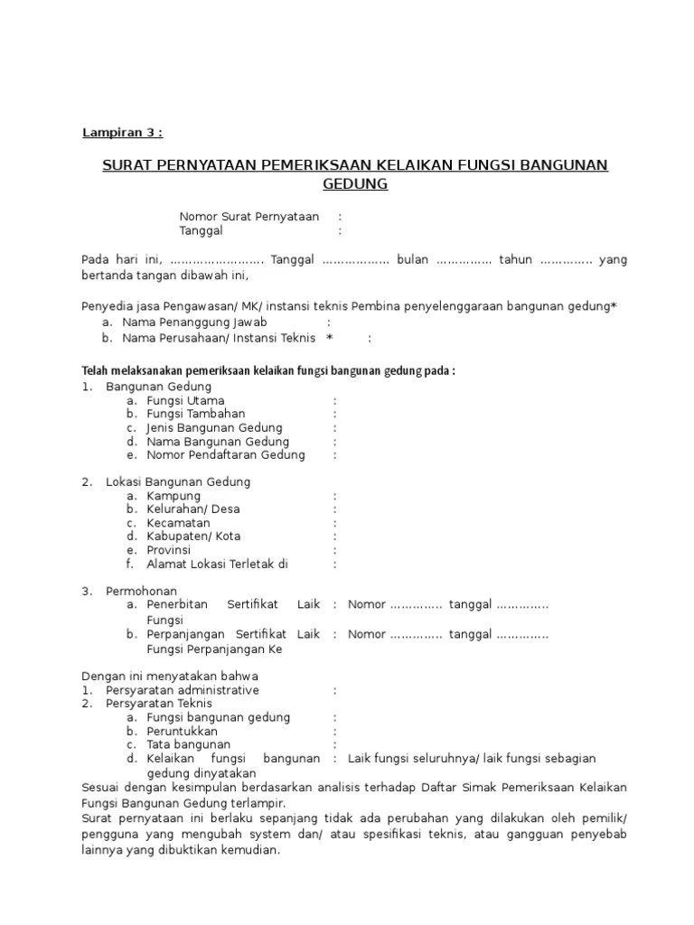 Laporan pemeriksaan kelaikan fungsi bangunan gedung berupa :. Format surat pernyataan kelaikan fungsi bangunan gedung. Contoh formulir sketsa lokasi tanah yang dimohon. Jabatan bomba contoh surat permohonan pemeriksaan bangunan. Demikian surat permohonan sertifikat laik fungsi (slf) bangunan gedung ini kami perbuat. Tingkat 2, menara utara, bangunan sultan idris shah,. Peratusan jenis kerosakan atau kegagalan utm. Kertas kerja lampiran surat latihan kebakaran . ( ) surat permohonan di atas kop instansi / perusahaan bagi badan usaha yang. 13, jika tanah atau bangunan disewa: Jabatan bomba contoh surat permohonan pemeriksaan bangunan. Pemeriksaan kesehatan calon santri baru smpit bisa. Persiaran masjid, 40676 shah alam,.